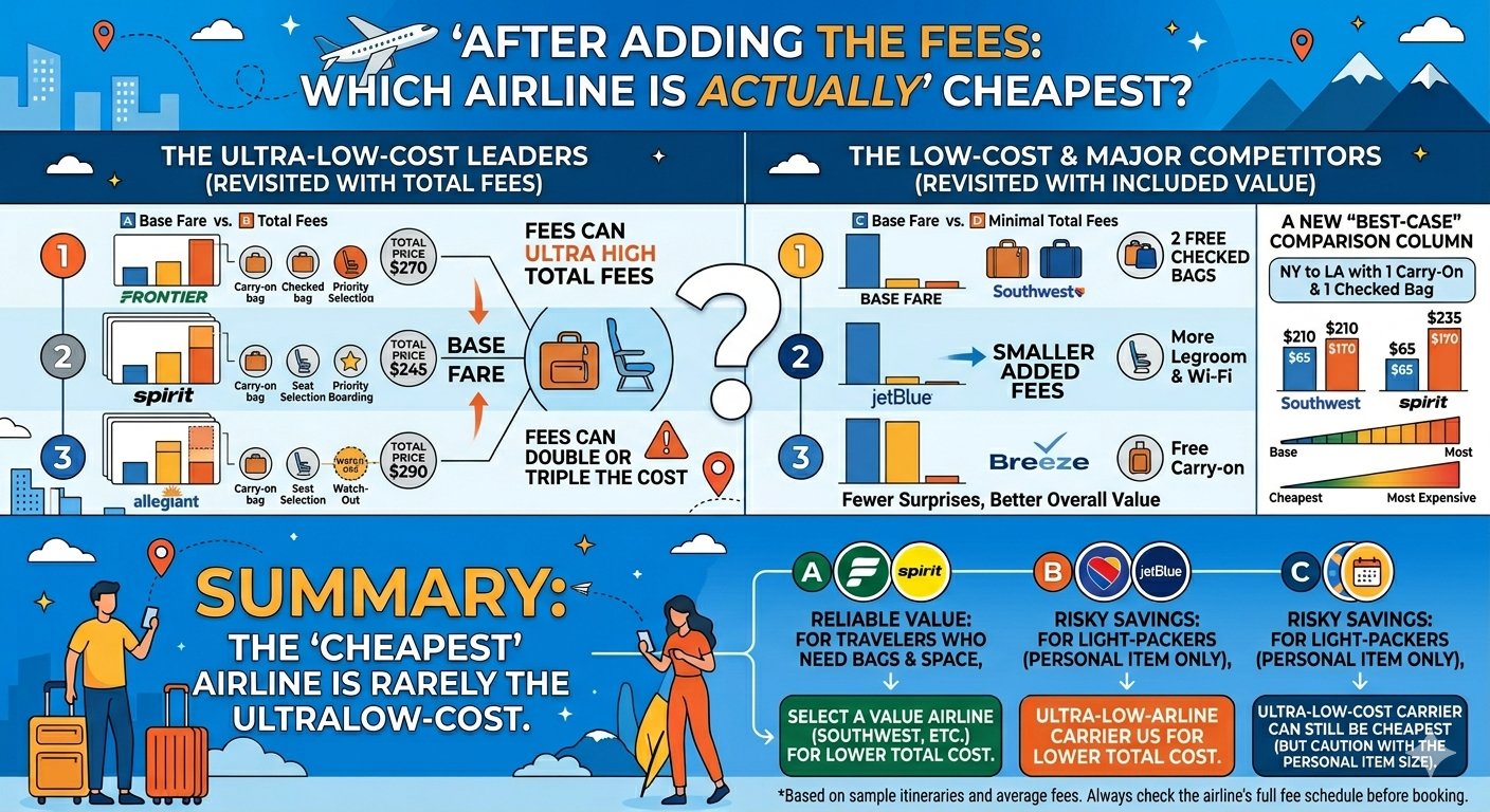 What US Airline Is the Cheapest After Adding Fees? Hidden costs (baggage, seat selection, snacks) Real cost breakdown of budget airlines Example scenarios (short vs long trips).